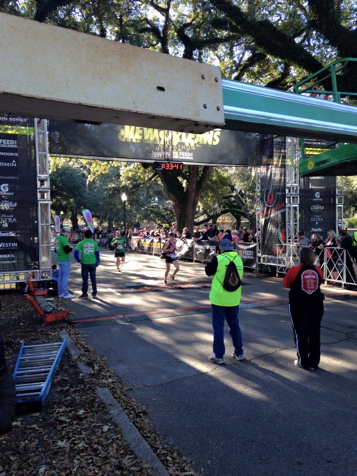 The mayor of New Orleans spoke briefly and thanked the thousands of runners from all over the world for attending. After the National Anthem we took off and the butterflies in my stomach settled through mile 1. I forgot my Garmin but was able to borrow one from my friend, Kerry Mullin AKA “The Bullet.” I like being able to see my pace as I race to help keep me on track.