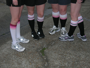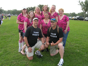 I swam, panicked a bit, regained my strength and managed a 34min swim which was okay for me and as I excited the water I heard them, all of them!!! My brother Kurt yelled, “Go Krista”!!! I saw all my girlfriends and heard many different voices scream my name. As the fog cleared and I was on the bike riding I spotted them again, they were all wearing pink stripped shirts that said Team Krista.