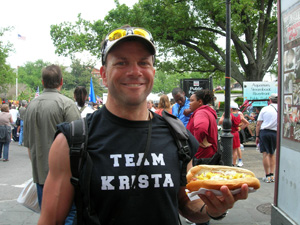 A half mile to go! I could hear the cheers and I saw David, my boyfriend who supported me all weekend and gave up his time to help me get ready for the race and was there every step of the way. It was comforting to see him and give him a hug and kiss because I knew he was happy for me. I speed up running through the finish line chute as every good spectathlete does:) I stopped one last time to hug and kiss my Dad and brother Kurt. They screamed we love you and I saw all the girls in Pink again holding their pick umbrellas and streamers attached to their bags.